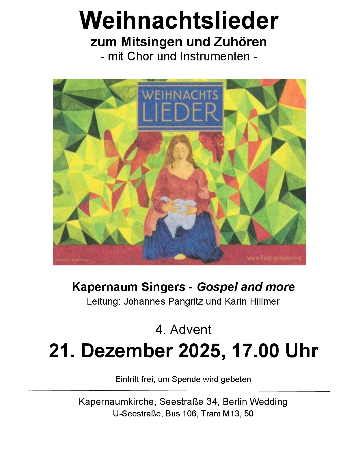 Sonntag, 21. Dezember 2025, 17.00 Uhr – Kapernaumkirche TeilenDruck Eintritt frei – Spende erbeten Schlagwörter: Konzert Weitere Artikel ansehen Vorheriger BeitragSonntag, 14. Dezember 2025, 17 Uhr – Kapernaumkirche Das könnte dir auch gefallen Sonntag, 14. Dezember 2025, 17 Uhr – Kapernaumkirche 14. November 2025 Freitags, 17.30 Uhr 4. November 2025 Mittwoch, 26. November 2025, 19.00 Uhr – Saal der Kapernaum-Gemeinde 26. Oktober 2025